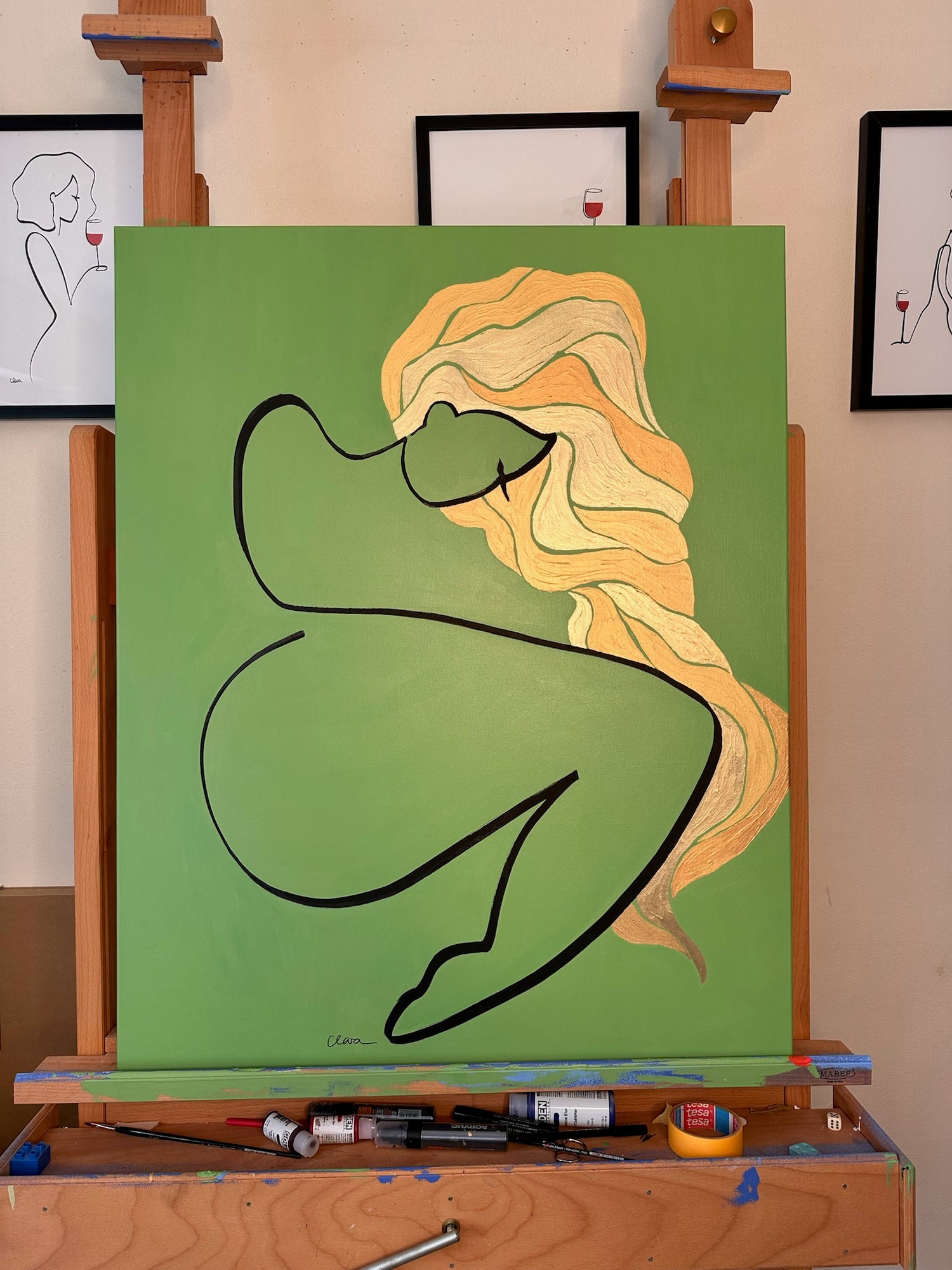 In ihrer Zeit als Musikerin entdeckte sie ihre Liebe zur one line art und saß 2017/2018 einen Winter lang täglich am Tisch und zeichnete unendliche Skizzen aus einer Linie. Diese Phase führte zur Spezialisierung auf das Sujet Frauen aus einer Linie.