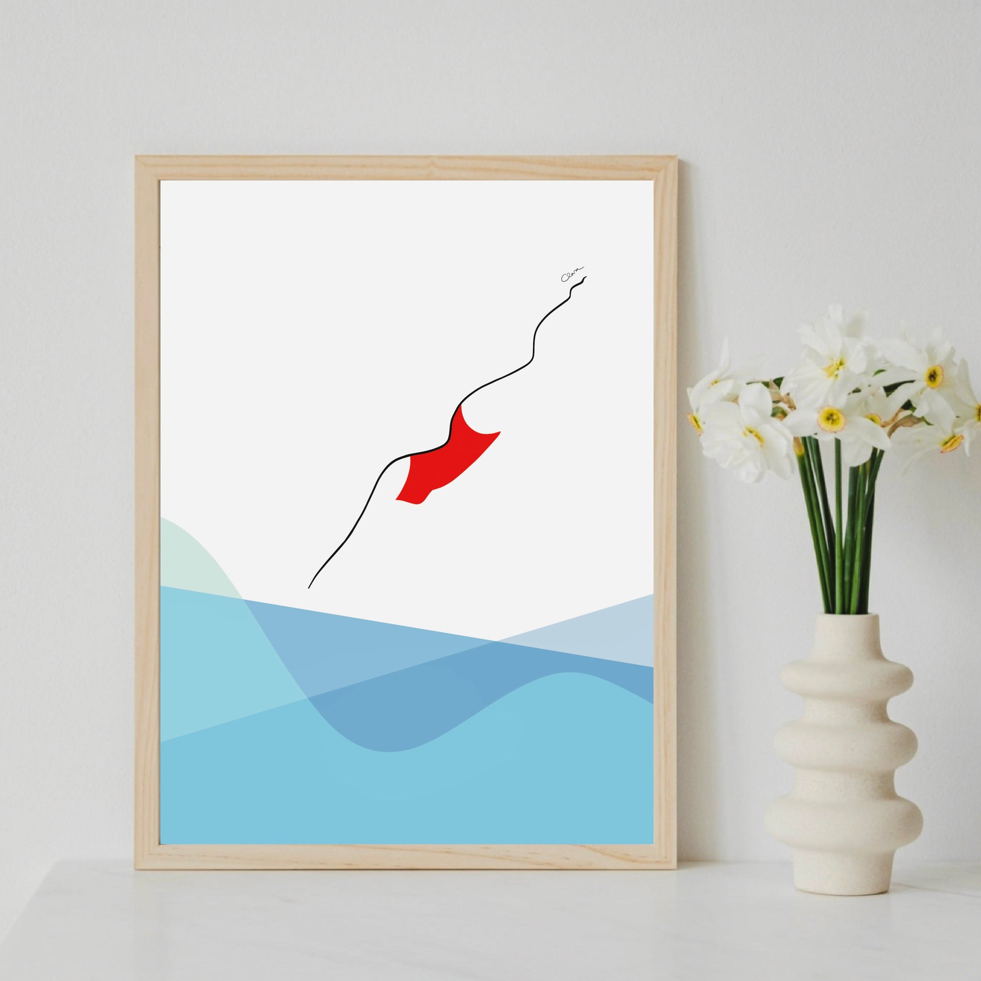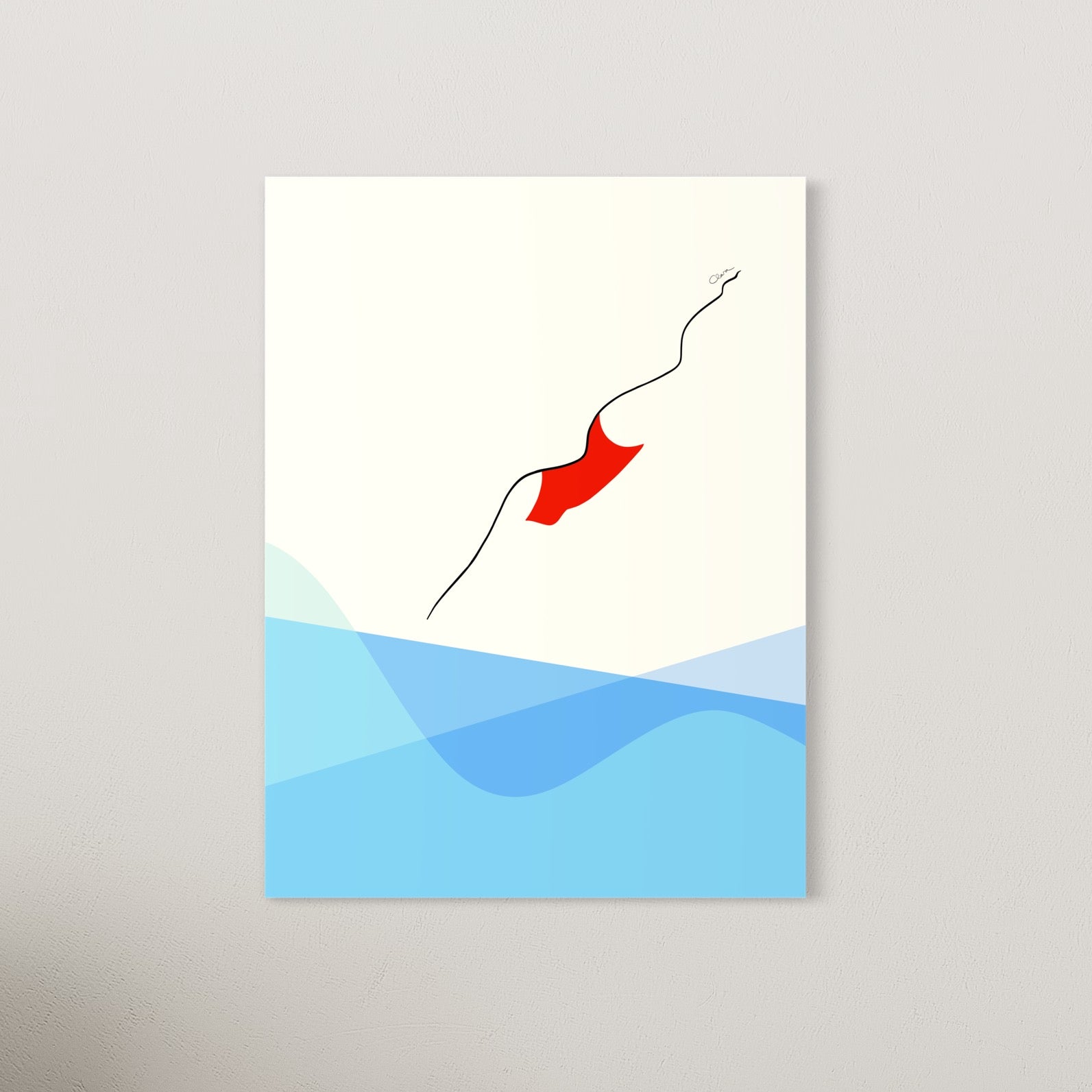 Eine Frau im roten Badeanzug springt kopfüber ins Wasser.
